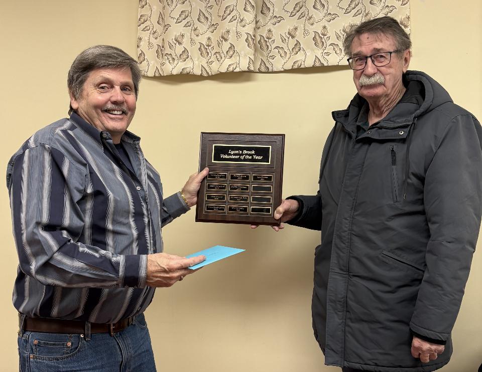 This year's recipient of the Lyon's Brook Volunteer of the Year is Len Thomas. Pictured below is Chair Peter Richardson making the presentation to Len.